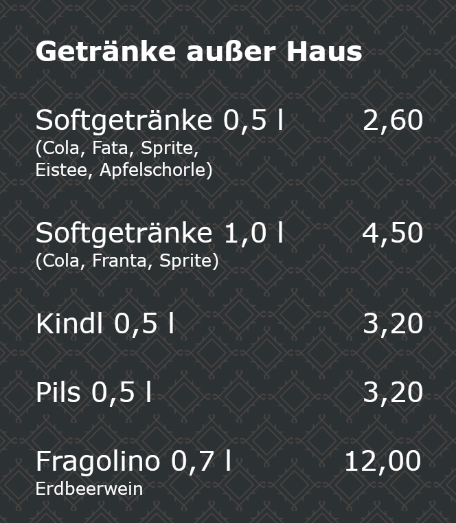 In den kalten Monaten sind wir Dienstag bis Sonntag von 12:00 bis 21:00 Uhr für Sie da.Montag ist Ruhetag.